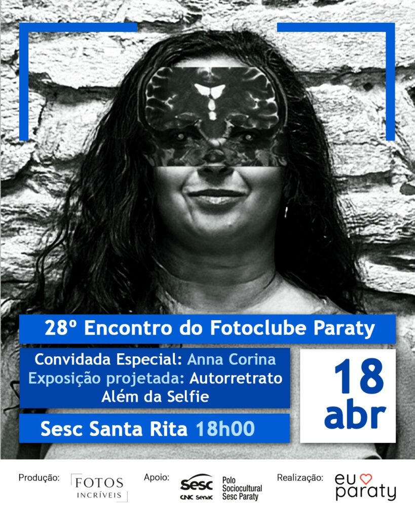 No próximo sábado, 18 de abril de 2026, o Fotoclube Paraty realiza seu 28º encontro em uma noite especial dedicada à fotografia, à arte e à força dos encontros presenciais. A programação acontece no Sesc Santa Rita, em Paraty, e reúne apresentação da artista visual Anna Corina e a projeção da exposição “Autorretrato Além da Selfie”, na sala de cinema.